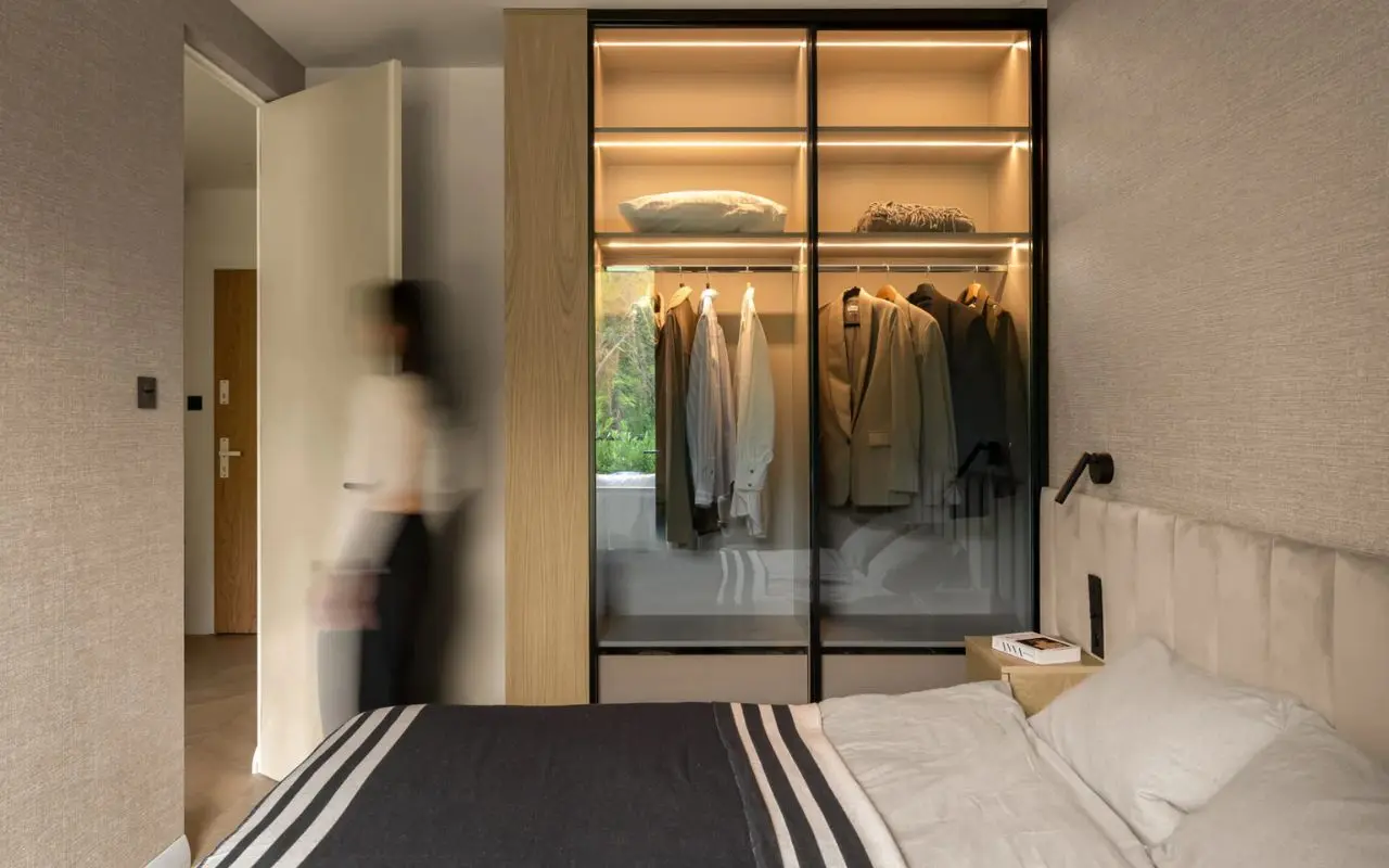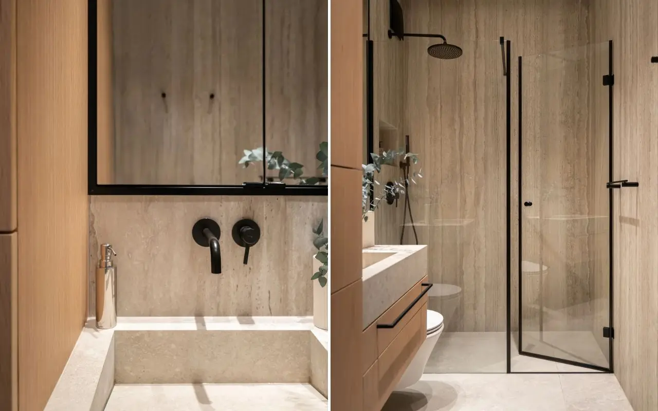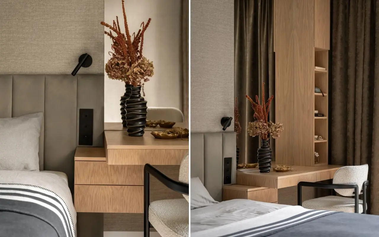 W małym mieszkaniu najłatwiej popełnić jeden błąd - próbować zmieścić zbyt wiele. Tutaj od początku było wiadomo, że przestrzeń ma dawać oddech. Dlatego zabudowy ukryto tak, by nie dominowały we wnętrzu. W holu powstały pojemne szafy, a ich fronty stapiają się ze ścianą. Podobnie wygląda łazienka, gdzie każdy centymetr został dobrze wykorzystany, choć nic nie sprawia wrażenia ciasnego ani przeładowanego. W przypadku tego wnętrza niezwykle ważne okazało się także konsekwentne powtarzanie tych samych materiałów. Ta sama płyta pojawia się w kilku pomieszczeniach, drewno przechodzi z salonu do sypialni, a neutralna paleta prowadzi wzrok przez całe wnętrze. Efekt jest prosty, ale bardzo skuteczny - mieszkanie wydaje się większe, spokojniejsze i bardziej uporządkowane.
