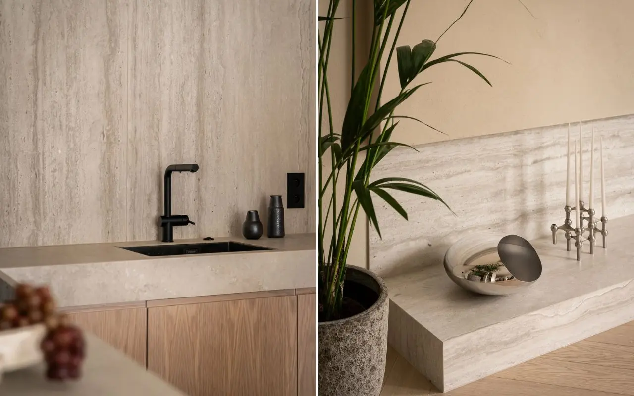 To mieszkanie urządzone w neutralnych kolorach pokazuje, że jasne wnętrze nie musi być monotonne. Projektantka zrezygnowała z mocnych wzorów i intensywnych barw, a charakter przestrzeni zbudowała za pomocą faktur. W całym mieszkaniu pojawiają się wielkoformatowe włoskie płyty, które spajają kolejne pomieszczenia. Widać je nie tylko w łazience, ale też w kuchni, gdzie tworzą masywny blat, oraz w salonie, gdzie zamieniają się w subtelny podest. Z tych samych płyt powstała nawet umywalka!