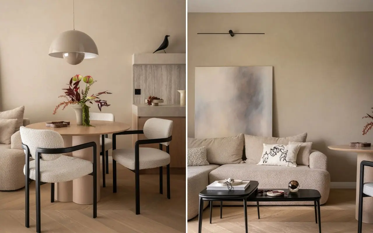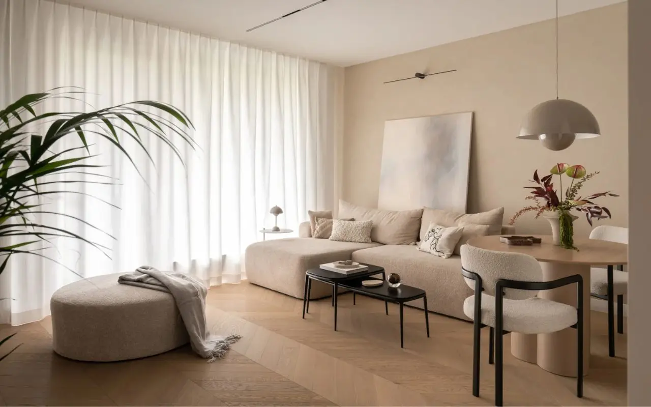 W rzeczywistości punktem wyjścia dla architektki były trzy słowa: “Oaza. Przestrzeń. Wolność”. Już od wejścia czuć, że w tym jasnym mieszkaniu w Gdyni rytm dnia zmienia się niemal natychmiast. Nie ma tu mocnych kontrastów, krzykliwych kolorów ani dekoracji, które próbują przejąć uwagę. Zamiast tego pojawia się spokojna sekwencja beży, złamanych bieli i ciepłych szarości. Miasto zostaje za drzwiami, a wnętrze zaczyna działać jak filtr - wycisza bodźce, porządkuje przestrzeń i pozwala odetchnąć. Jednocześnie wnętrze to, chociaż inspirowane spokojem i minimalizmem, dalekie jest od chłodnej, sterylnej estetyki. Neutralność nie oznacza tu pustki. Przeciwnie - mieszkanie urządzone w neutralnych kolorach zyskuje głębię dzięki światłu, materiałom i subtelnym różnicom faktur.