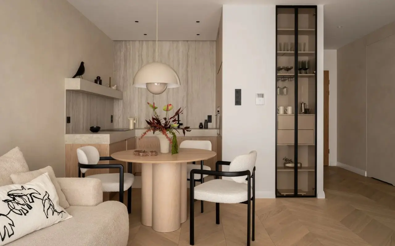 Minimalistyczne mieszkanie nie potrzebuje mocnych kolorów, dekoracyjnych dodatków ani efektownych kontrastów. Wystarczą światło, proporcje i naturalne materiały we wnętrzu. Gliniany tynk miękko rozprasza promienie wpadające przez okna, bielona jodełka ociepla przestrzeń, a wielkoformatowe płyty porządkują niewielki metraż. Dzięki temu mieszkanie urządzone w neutralnych kolorach nie wydaje się chłodne ani zbyt surowe. Spokój wynika tu przede wszystkim z dobrze przemyślanej prostoty.