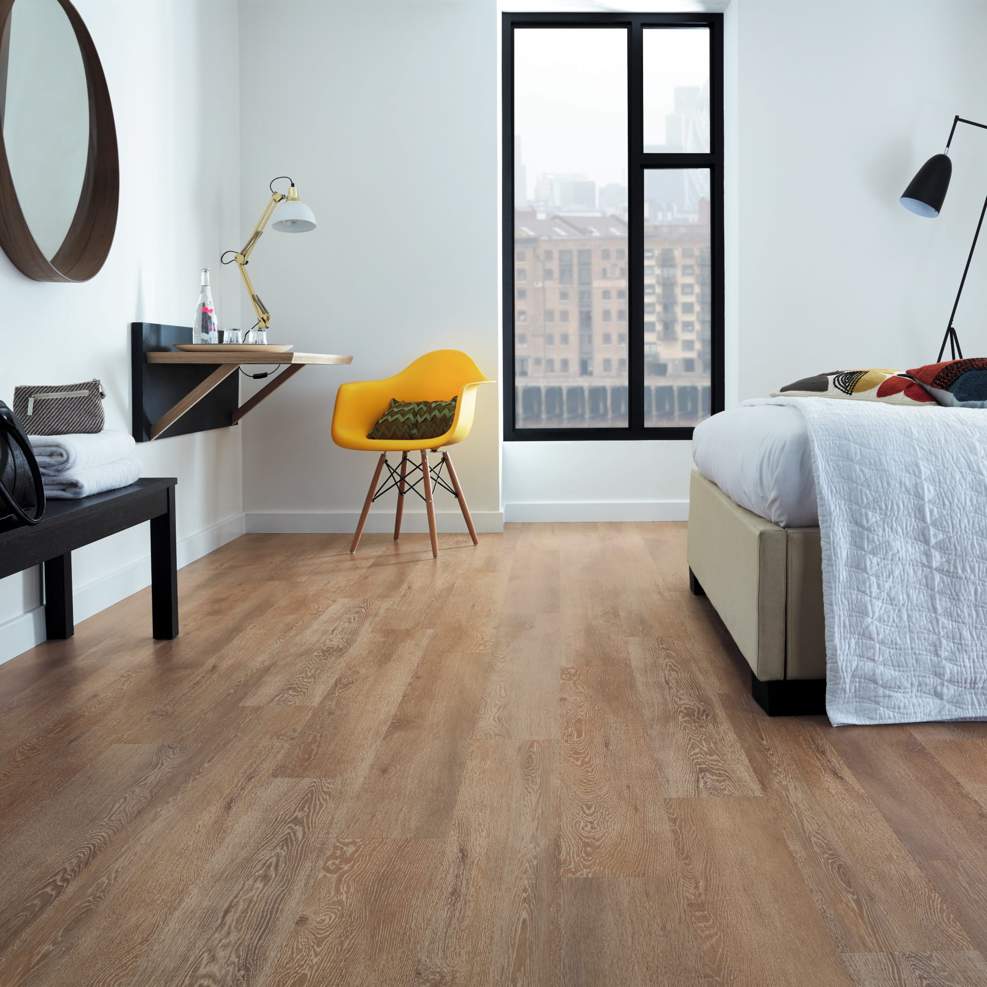 Palio Click i Palio Core to nowy typ podłogi winylowej ze wzmocnionym rdzeniem i opatentowanym systemem szybkiego montażu click-lock. Sztywniejszy rdzeń Palio Core oznacza możliwość instalacji podłogi na nierównych powierzchniach lub istniejącej podłodze z ceramiki, drewna lub desek, bez obawy o uwypuklenie niedoskonałości. Produkt ten nazywany jest również pływającą podłogą o znakomitych właściwościach akustycznych, cieplnych i wodoodpornych. Panele nie pochłaniają wody ani nie pęcznieją pod jej wpływem. Podłogi winylowe Click System są wspaniałą propozycją do wnętrz komercyjnych i mieszkalnych. Mechanizm zatrzaskowy pozwala na bardzo szybką instalację, a wstępnie zamocowane podłoże akustyczne eliminuje konieczność stosowania oddzielnego podkładu. Panele winylowe PVP150-SCB Levanzo dostępne są także w wariancie na klej. Zobacz Designflooring PVP150 w wersji klejonej.