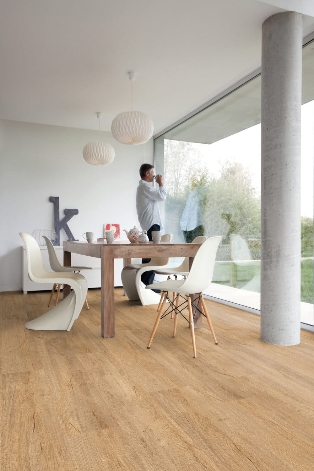 Panele winylowe Gerflor Rigid 55 Lock Acoustic 0015 Kilda Golden to doskonałe rozwiązanie dla tych, którzy poszukują łatwego sposobu na renowację podłogi. Dzięki ich innowacyjnemu systemowi instalacji na zamek zatrzaskowy montaż staje się szybki i bezproblemowy. Panele te charakteryzują się doskonałą izolacją dźwiękową na poziomie 18 dB oraz wysoką odpornością na poślisk klasy R10. Są idealnym wyborem dla miejsc o umiarkowanym natężeniu ruchu, takich jak biura, mieszkania czy domy. Ich wysoka odporność na ścieranie oraz łatwość montażu sprawiają, że są one praktycznym rozwiązaniem zarówno do użytku komercyjnego, jak i domowego. Dodatkowo panele te posiadają ekskluzywną konstrukcję "Full Rigid Core", która zapewnia wysoką stabilność oraz trwałość. Matowy lakier PUR+Mat nadaje im naturalnego wyglądu i ułatwia czyszczenie. Panele winylowe Gerflor Rigid 55 Lock Acoustic 0015 Kilda Golden są przyjazne dla środowiska - wykonane w 100% z materiałów nadających się do recykling. W dodatku nie zawierają ftalanów, a poziom szkodliwych lotnych związków organicznych wynosi mniej niż 100 µg/m3, co oznacza, że są one zarówno ekologiczne, jak i bezpieczne dla zdrowia ich użytkowników.
