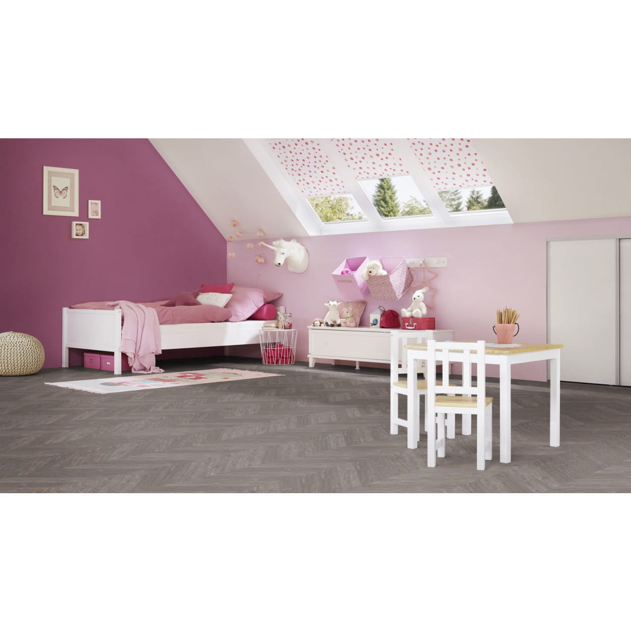 Kolekcja imponujących paneli winylowych Project Floors Chevron 55 to zbiór sześciu wzorów podłóg w uroczą, węgierską jodełkę. Te skomplikowane i doskonałe posadzki to jeden z najgorętszych trendów. Deski ustawione są pod kątem 60°, co otwiera drzwi do szeregu nowych układów i projektów inspirowanych XVII-wiecznymi rezydencjami. Kolekcja paneli winylowych Project Floors Chevron 55 w jodełkę dostępna jest w formacie desek 45,7 x 10,2 cm, charakteryzujących się lewymi i prawymi listwami, które należy ułożyć na przemian pod kątem 45°. Ponadto posadzka posiada certyfikat "Indoor Air Comfort Gold" oraz TÜV, który świadczy o tym, że produkty są niskoemisyjne i w pełni bezpieczne.