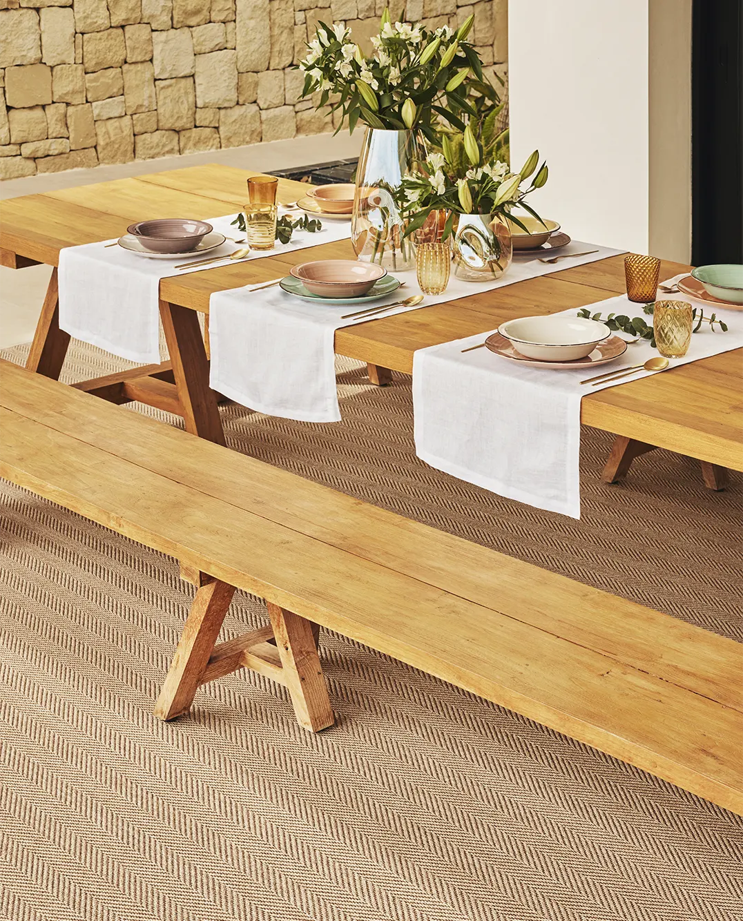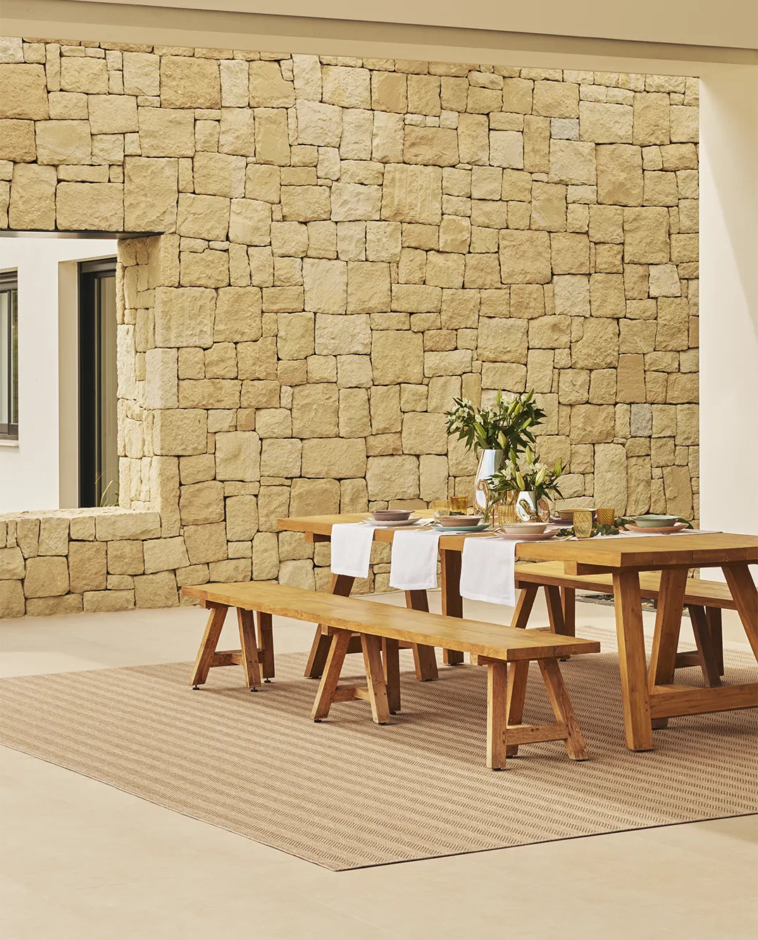 Dywan Rols Palma Icon Sand to idealne rozwiązanie do zewnętrznych i wewnętrznych aranżacji. Wykonano go głównie z polipropylenu na krośnie tkanym na płasko, przez co charakteryzuje się on wysoką trwałością i odpornością na trudne warunki użytkowe. Dzięki specjalnemu zabezpieczeniu UV dywan ten nie blaknie pod wpływem promieniowania słonecznego. Jest wodoodporny i łatwy w utrzymaniu, co czyni go praktycznym wyborem dla tarasów, altan czy balkonów. Design dywanu Rols Palma Icon Sand nawiązuje do niezwykle modnej juty, którą bardzo łatwo zaaranżować. Jego neutralna kolorystyka idealnie komponuje się z różnorodnymi meblami i dodatkami. Dywan jest kompatybilny z ogrzewaniem podłogowym, co zwiększa komfort użytkowania w chłodniejsze dni. Rols Palma Icon Sand wykazuje właściwości antystatyczne, co minimalizuje gromadzenie się kurzu i ułatwia jego czyszczenie. Regularne odkurzanie bez użycia szczotek obrotowych zapewnia jego długotrwały, estetyczny wygląd.